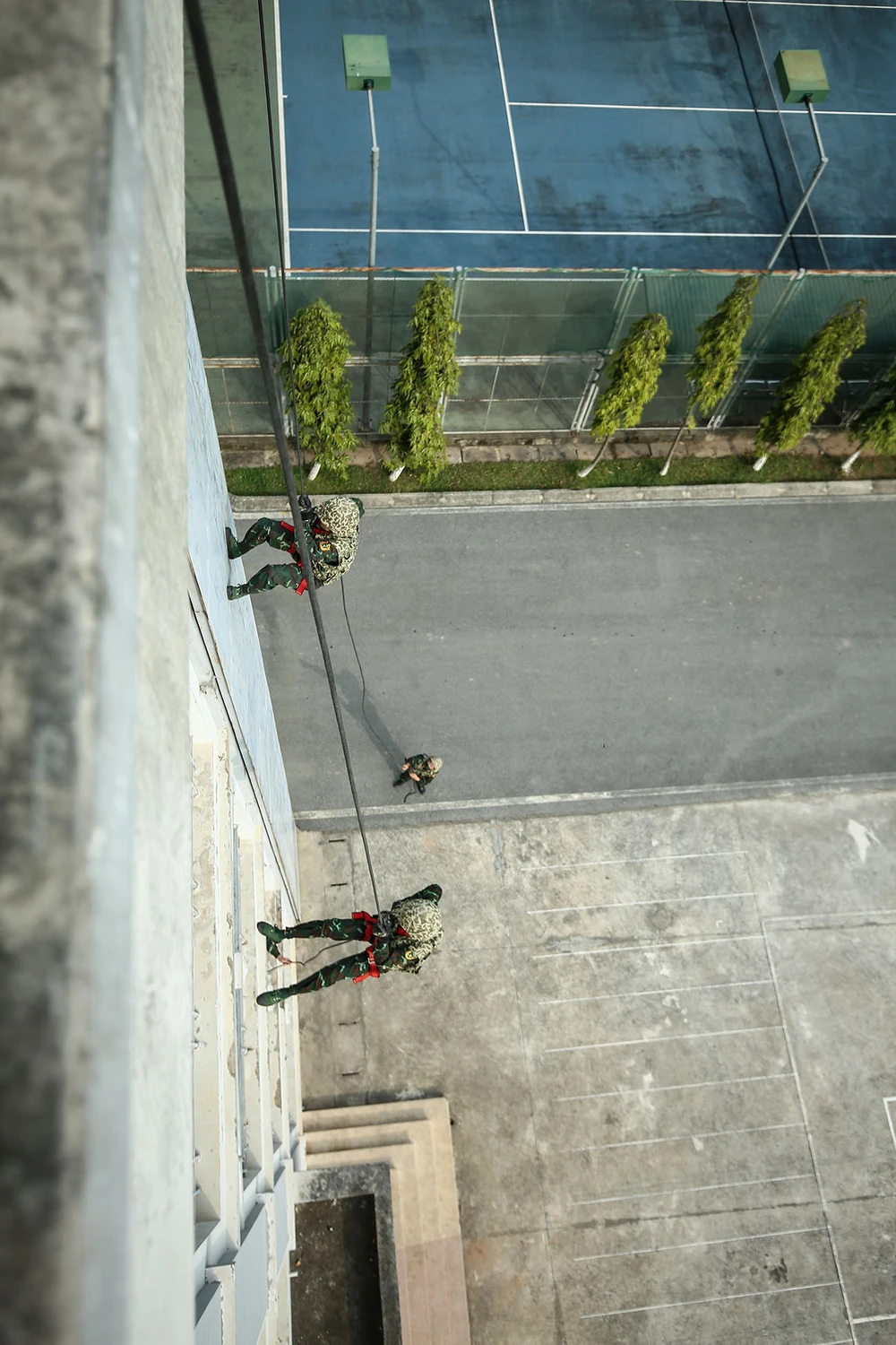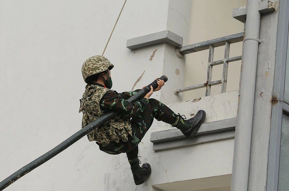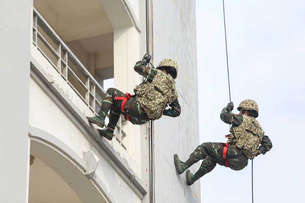 Hình ảnh các nữ đặc công thực hiện kỹ năng đu dây.