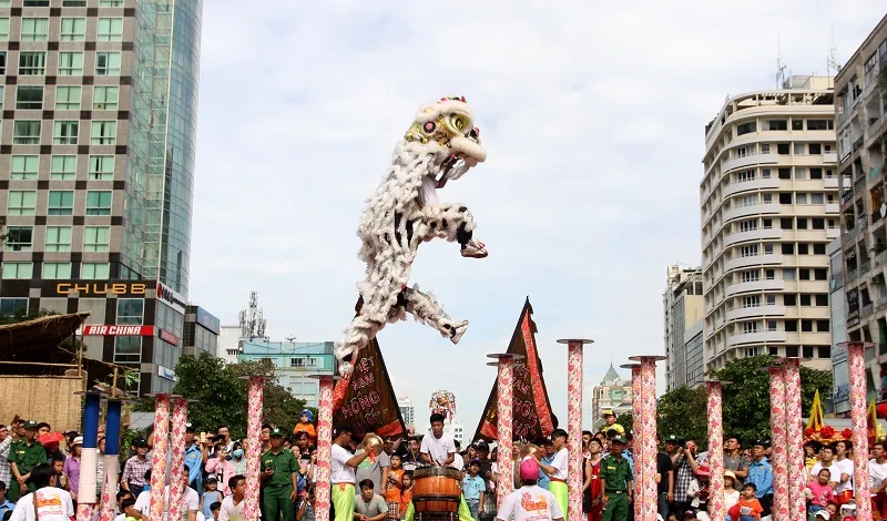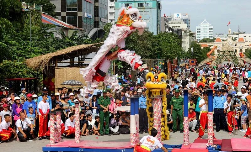 Từ sáng , các đoàn lân - sư - rồng có màn diễu hành theo sáu cung đường gồm Lê Lợi; Huỳnh Thúc Kháng - Pasteur - Tôn Thất Thiệp; Hồ Tùng Mậu - Huỳnh Thúc Khánh; Hàm Nghi - Hải Triều; Đồng Khởi - Nguyễn Thiệp; Ngô Đức Kế rồi về phố đi bộ Nguyễn Huệ để biểu diễn các tiết mục từng đoạt các giải quốc tế và đạt các kỷ lục Việt Nam như Lân lên Mai Hoa Thung, Nấc thang vượt bậc, Lân mẫu xuất nhi...