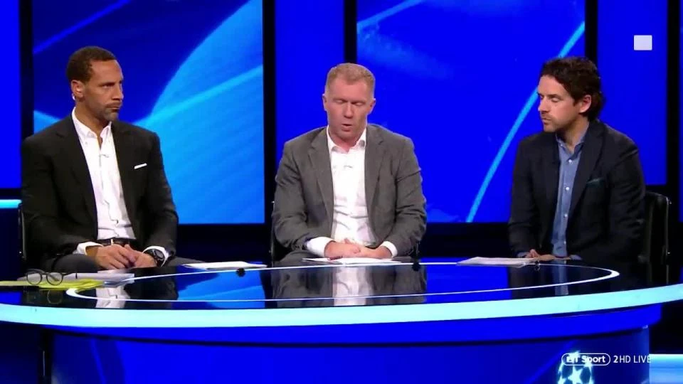 Paul Scholes (giữa) gà gật trong một chương trình bình luận trận Man United hòa Valencia cùng với Rio Ferdinand (trái) và Owen Hargreaves.