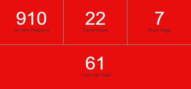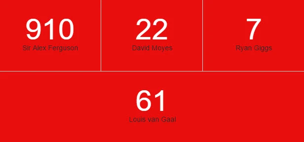 Các cầu thủ MU đã ghi được 910 bàn thắng (91%) trên sân nhà dưới sự dẫn dắt của HLV Sir Alex Ferguson. Trong khi đó, dưới thời David Moyes, MU chỉ có 22 bàn thắng trên sân nhà, Giggs chỉ có hai trận dẫn dắt MU trên sân nhà nhưng đội có tới bảy bàn thắng. Hiện tại, MU dưới thời Louis Van Gaal đã có 61 bàn thắng trên sân nhà Old Trafford.