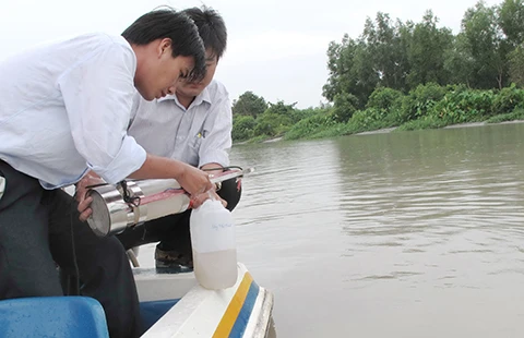 Kiểm tra chất lượng nước thô ở khu vực lấy nước Nhà máy nước Tân Hiệp. Ảnh: TRUNG THANH