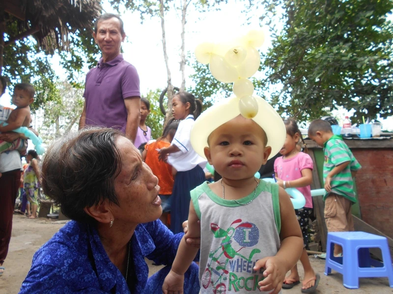 Một em bé thích thú với cái mũ bằng bong bóng được các anh làm cho. Ảnh: THANH TUYỀN