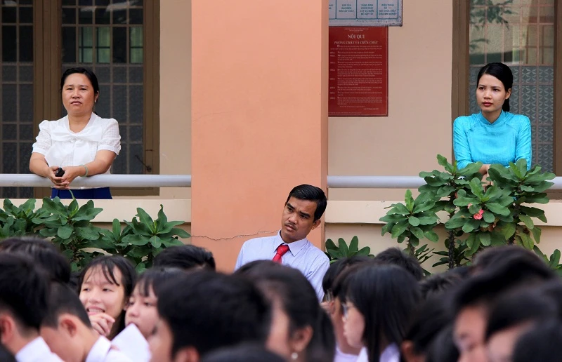 Sân trường chật kín học sinh, các thầy cô phải đứng bên trong trường để nhìn ra sân và lắng nghe.