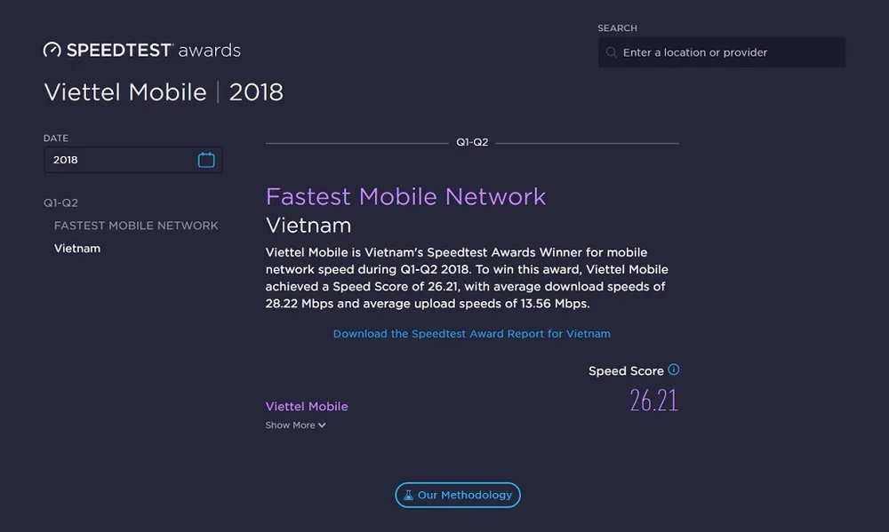 Speedtest cũng cho biết Viettel là nhà mạng Việt Nam đầu tiên và duy nhất từ trước đến nay có được danh hiệu này. Quá trình đánh giá và tổng hợp kết quả về các nhà mạng ở Việt Nam được Speedtest thực hiện hoàn toàn độc lập, khách quan và không có bất cứ thông báo trước nào cho các nhà cung cấp dịch vụ Internet di động. Cũng theo số liệu Speedtest đo được, mạng di động Viettel chiếm vị trí dẫn đầu về tốc độ trong suốt ba năm gần đây.