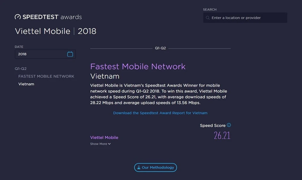 Danh hiệu được trao dựa trên thống kê từ hàng triệu kết quả do người dùng chủ động sử dụng ứng dụng SpeedTest để kiểm tra tốc độ Internet di động tại Việt Nam trong sáu tháng đầu năm 2018.