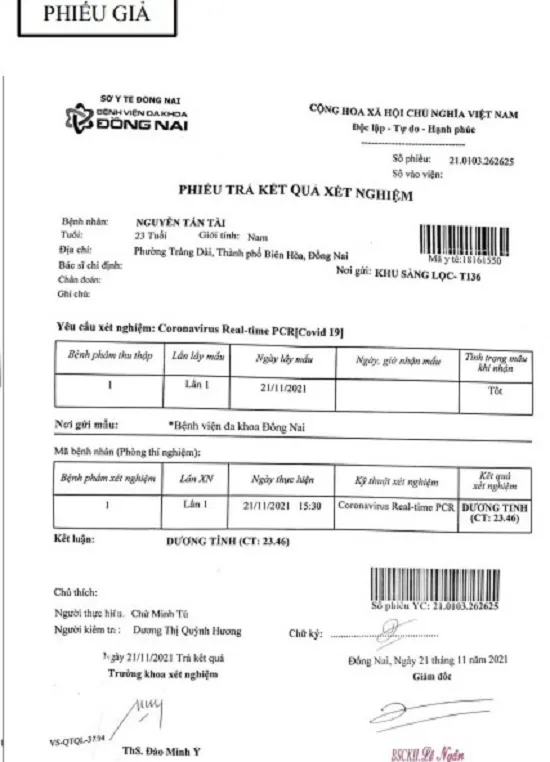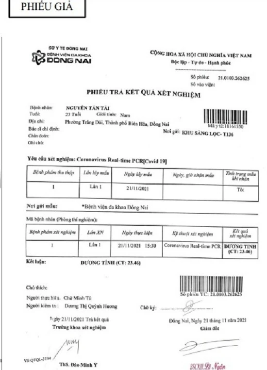 Theo đó, Bệnh viện Đa khoa Đồng Nai vừa phát hiện trường hợp người đàn ông mang giấy xét nghiệm COVID-19 giả đến bệnh viện để yêu cầu đóng dấu mộc của bệnh viện vào giấy xét nghiệm có kết quả dương tính với SARS-CoV-2.