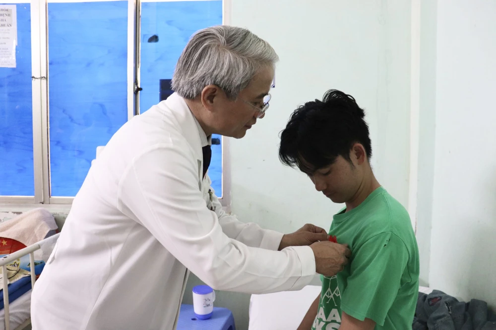BS Võ Đức Chiến, Giám đốc bệnh viện Nguyễn Tri Phương cùng Thượng Tọa Thích Thiện Thuận đến thăm hỏi và cài bông hồng cho các bệnh nhân. Ảnh: TRẦN MINH |