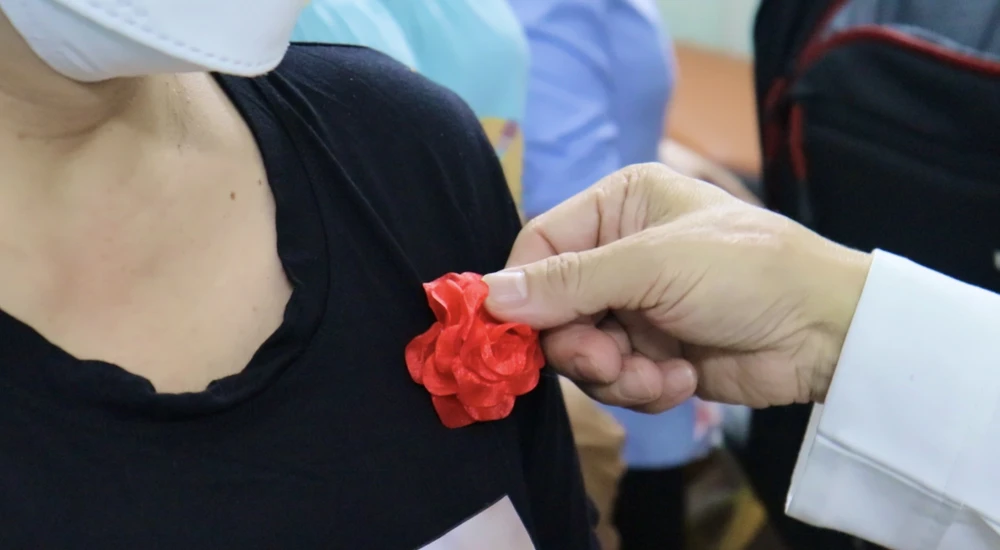 Thượng tọa Thích Thiện Thuận cài bông hồng cho các y bác sĩ. Ảnh: TRẦN MINH |