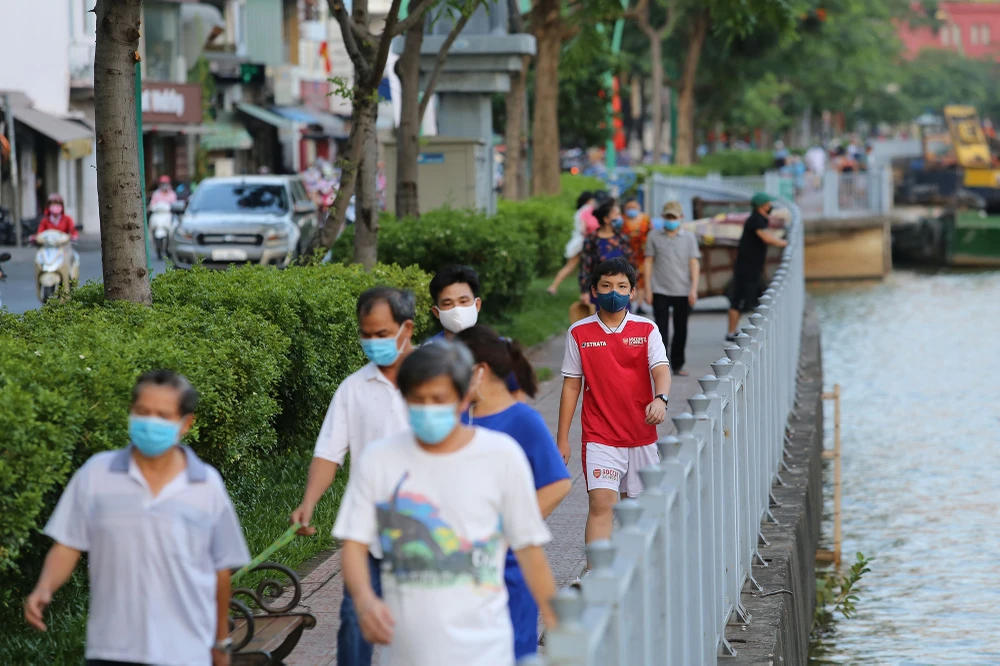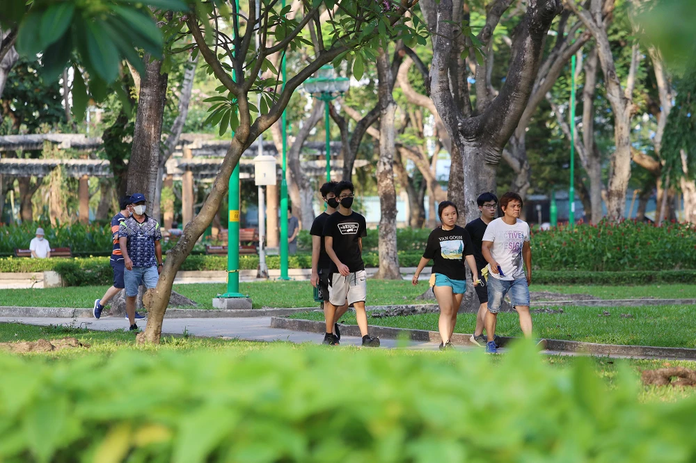 Nhiều người đi dạo ở Công viên Lê Văn Tám (quận 1), số ít người vẫn lơ là, không đeo khẩu trang theo quy định.