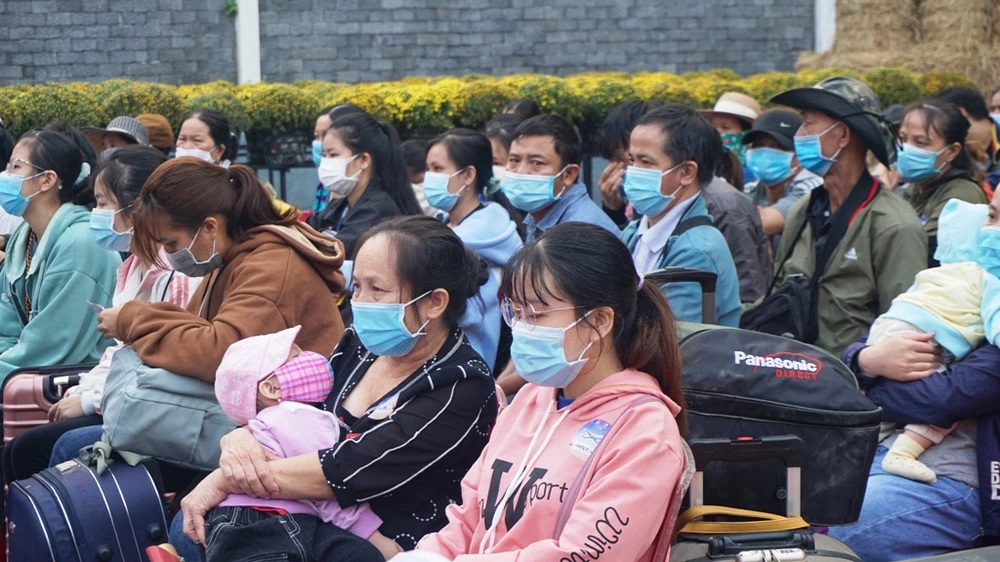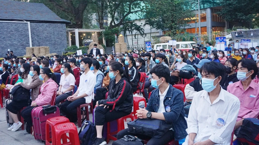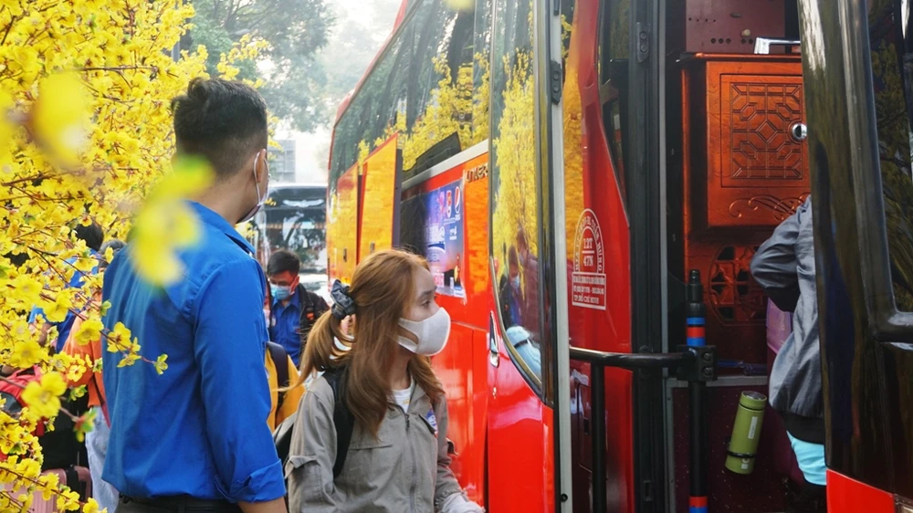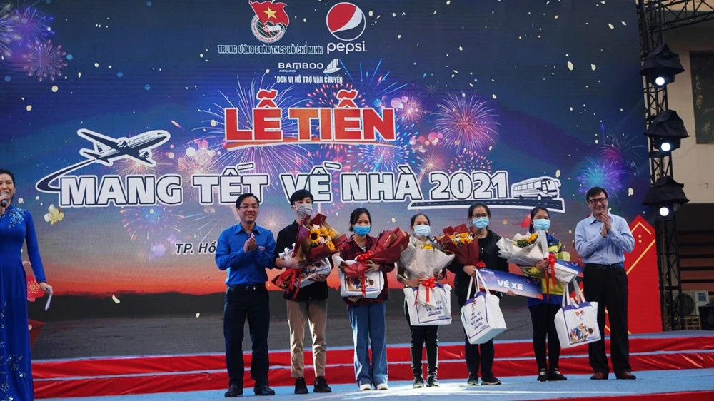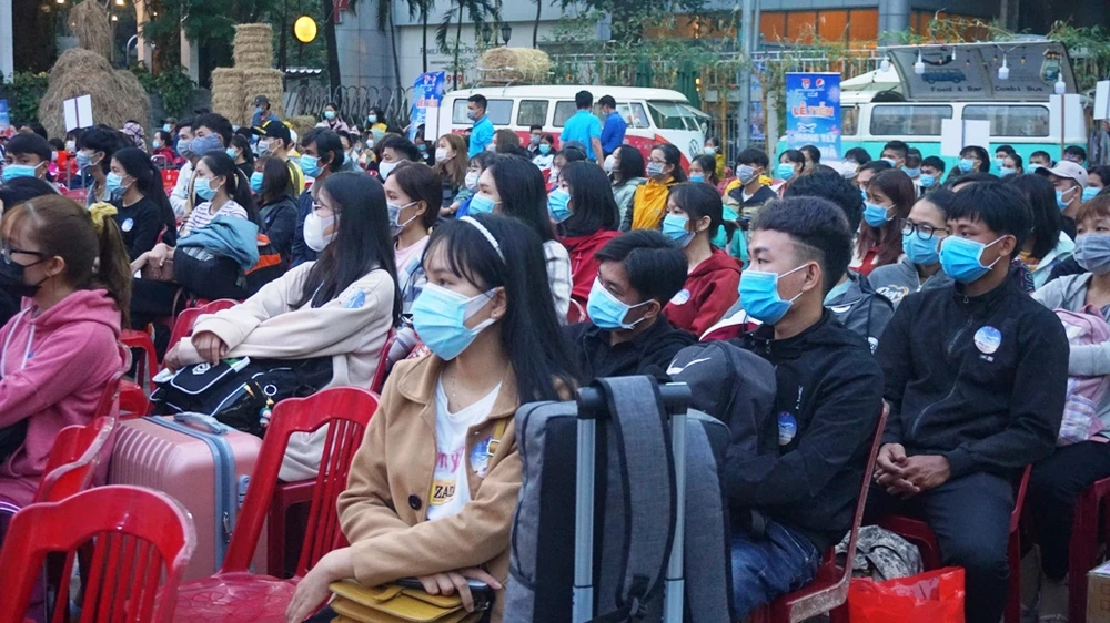 Sáng 1-2, lễ tiễn sinh viên, thanh niên công nhân, người lao động có hoàn cảnh khó khăn về quê ăn tết với tên gọi "Mang Tết về nhà" đã diễn ra tại Nhà văn hóa Thanh Niên.