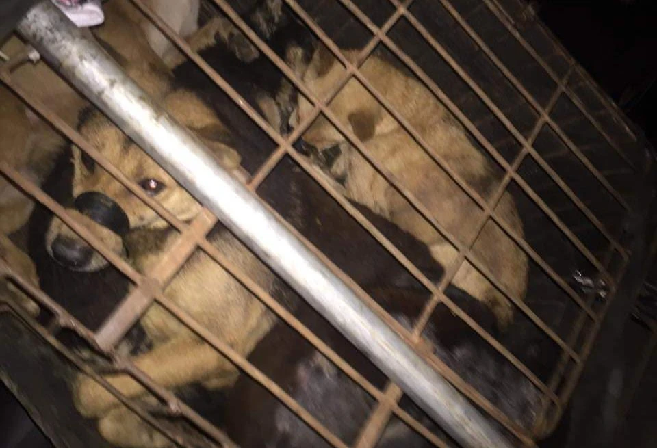 Công an thu giữ 5 con chó bị cột miệng bỏ vào lồng sắt.