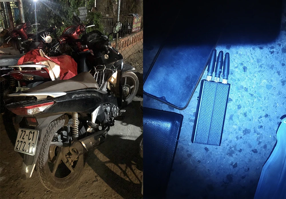 Tại trụ sở, Công an phát hiện trong người thanh niên có một bộ thiết bị phá sóng định vị xe máy. Nghi can khai tên là Vũ Ngọc T. (SN 1990, quê Nghệ An).