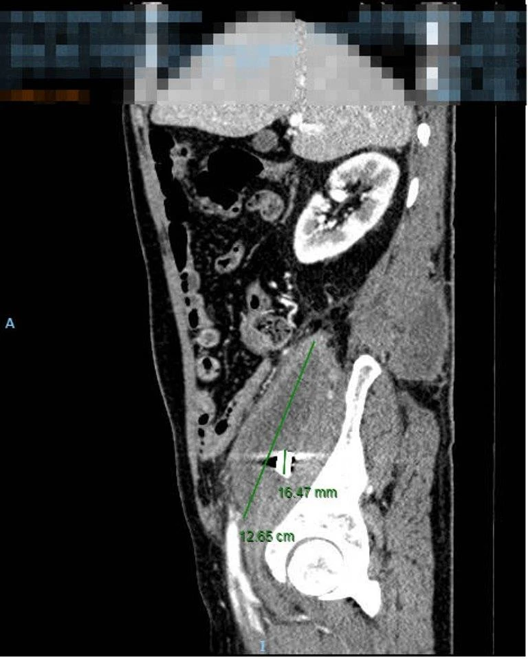 Qua thăm khám toàn diện, chụp cắt lớp điện toán vùng bụng tại BV ĐH Y dược TP.HCM, các BS phát hiện bệnh nhân có một ổ áp xe to tại vùng cơ thắt lưng chậu phải, ổ áp xe đã lan ra sau lưng. Ghi nhận hình ảnh nghi ngờ của mảnh kim loại, tương ứng với mảnh đạn từng kẹt lại trong người ông K.