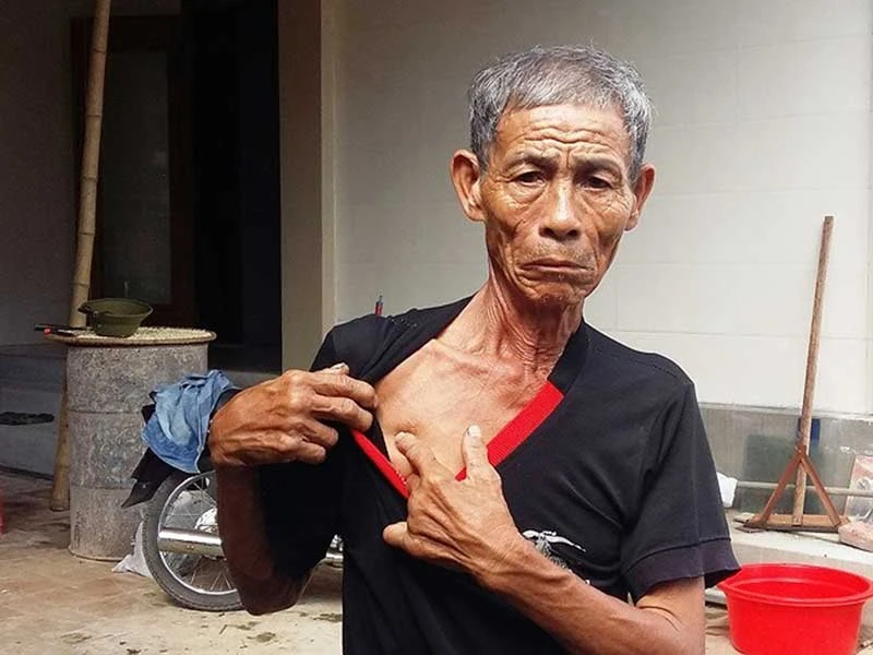 Ông Trần Văn Hai (ảnh trên) với vết thương và mảnh đạn còn nằm trong người và thẻ thương binh của ông Trần Văn Hai không còn giá trị, ông bị mang tiếng là thương binh giả dù trên thẻ có ghi mảnh kim khí nằm ở nhũ mô phổi.