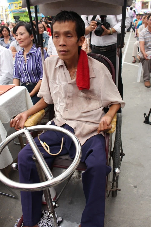 Nhiều người trong số họ từng là đồng nghiệp cũ đã vội tay bắt mặt mừng khi gặp lại nhau. Chúng tôi bắt gặp một người đàn ông đang gắn sức bẻ lái bánh xe lăn để yên vị vào hàng ghế đầu. Khuôn mặt khắc khổ. Mái tóc điểm hoa râm. Thân người anh nhỏ thó, đen nhẻm, tay và chân tong teo khác thường. Quan sát, một đường ống dài được nối từ quần vào túi nilông y tế lớn bên hông anh.