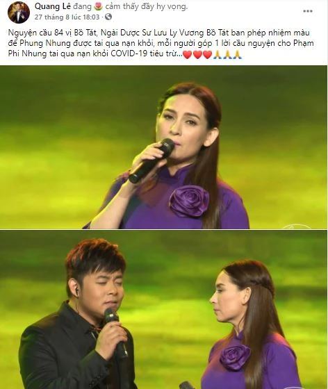 Quang Lê cầu nguyện: “Nguyện cầu 84 vị Bồ Tát, Ngài Dược Sư Lưu Ly Vương Bồ Tát ban phép nhiệm màu để Phi Nhung được tai qua nạn khỏi, mỗi người góp một lời cầu nguyện cho Phạm Phi Nhung tai qua nạn khỏi COVID-19 tiêu trừ”.