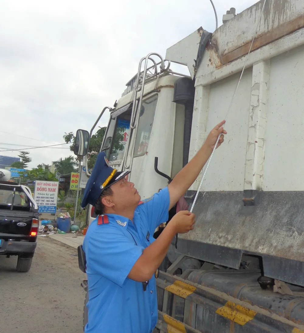 Hiện tượng xe cơi nới, thay đổi kích thước thùng xe để chở quá tải vẫn diễn ra. Trong ảnh: Thanh tra giao thông đo, kiểm tra kích thước thùng xe ben so với giấy chứng nhận kiểm định.