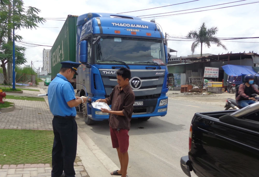 Thanh tra giao thông đội số 1 kiểm tra xe container đi vào giờ cấm, đường cấm trên đường Liên Phường thuộc quận 9