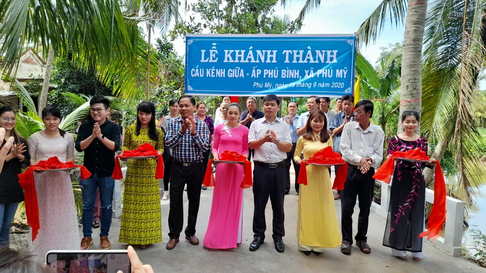 Lãnh đạo huyện Mỏ Cày Bắc, lãnh đạo xã Phú Mỹ cùng nhà tài trợ cắt băng khánh thành cầu Kênh Giữa. Ảnh: Đ.Hà