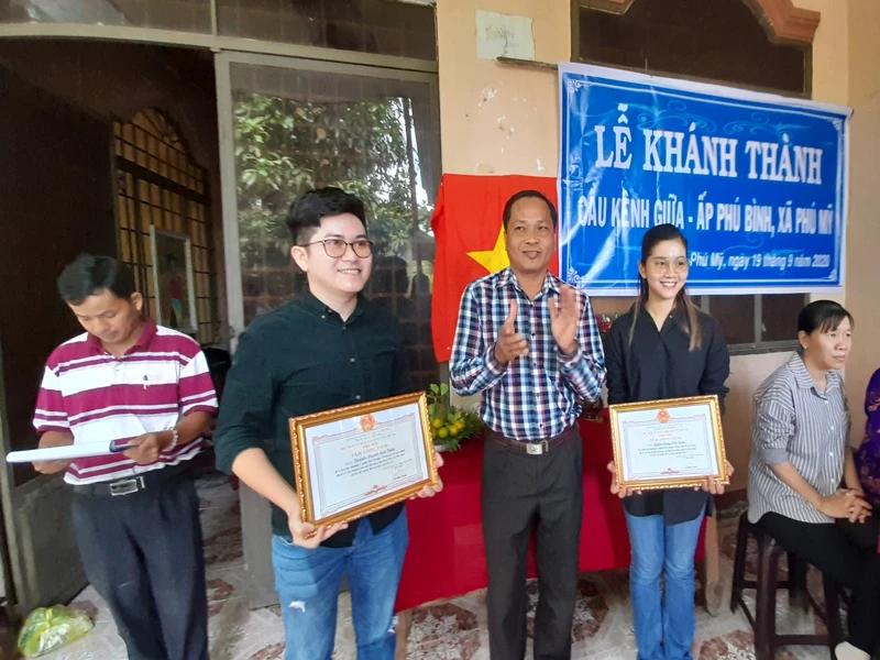 UBND xã Phú Mỹ tặng bảng tri ân tấm lòng vàng cho hai nhà tài trợ Nguyễn Hoàng Hiếu Hạnh và Nguyễn Huỳnh Anh Tuấn. Ảnh: Đ.Hà