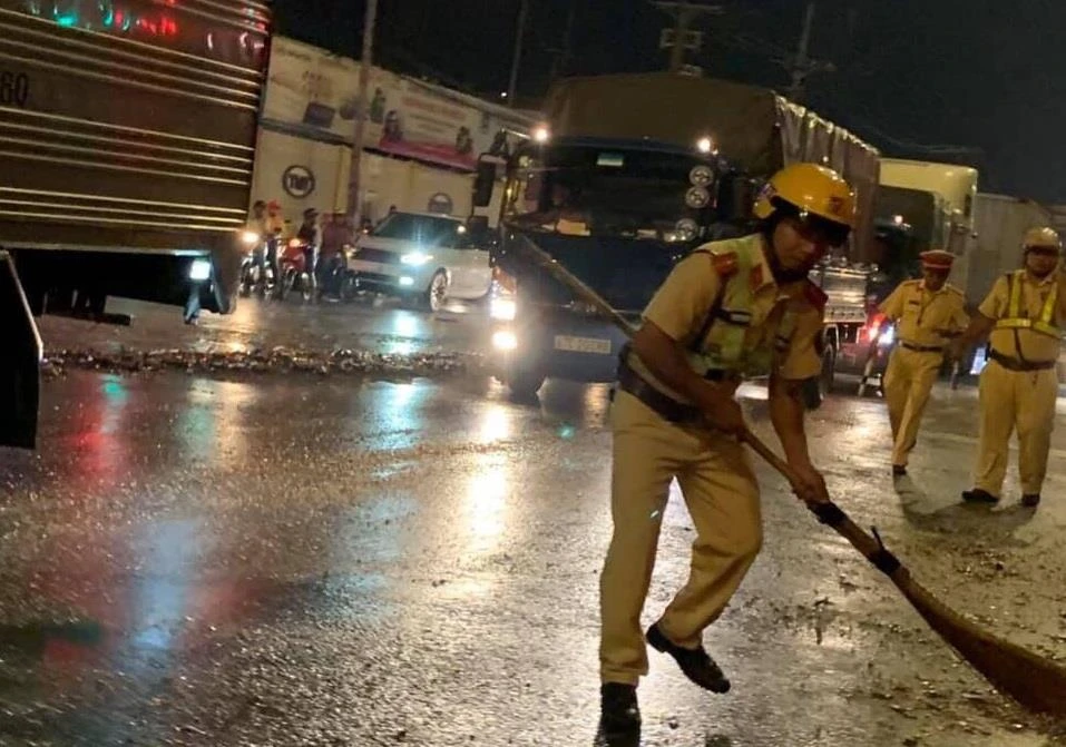 Lực lượng CSGT đã mượn chổi của nhà dân để nhanh chóng quét dọn mặt đường, thu gom hàng ngàn mảnh vỡ, nhanh chóng trả lại mặt đường thông thoáng, an toàn cho người dân.