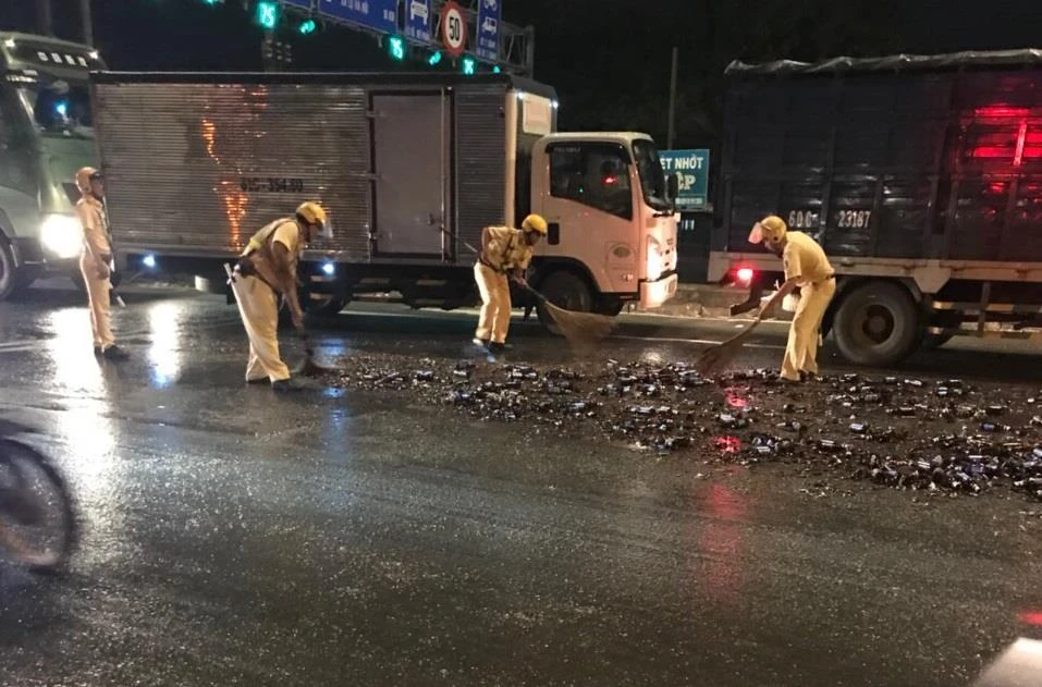 Gần 10 tối 16-7, Đội CSGT-TT quận 12, TP.HCM nhận tin báo có xe tải chở bia gặp sự cố trên Quốc lộ 1 làm chai bia thủy tinh rơi xuống đường, vỡ nát.