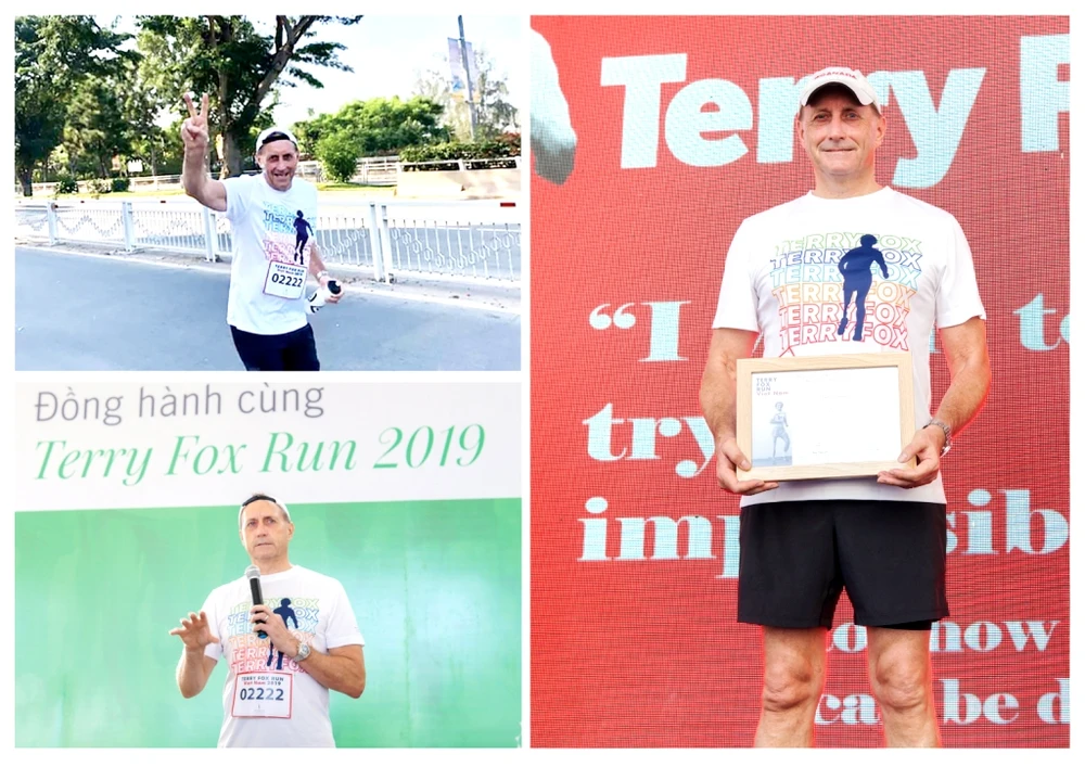 Ông Kim Fleming trên đường chạy và trên sân khấu nhận lời cám ơn từ ban tổ chức.