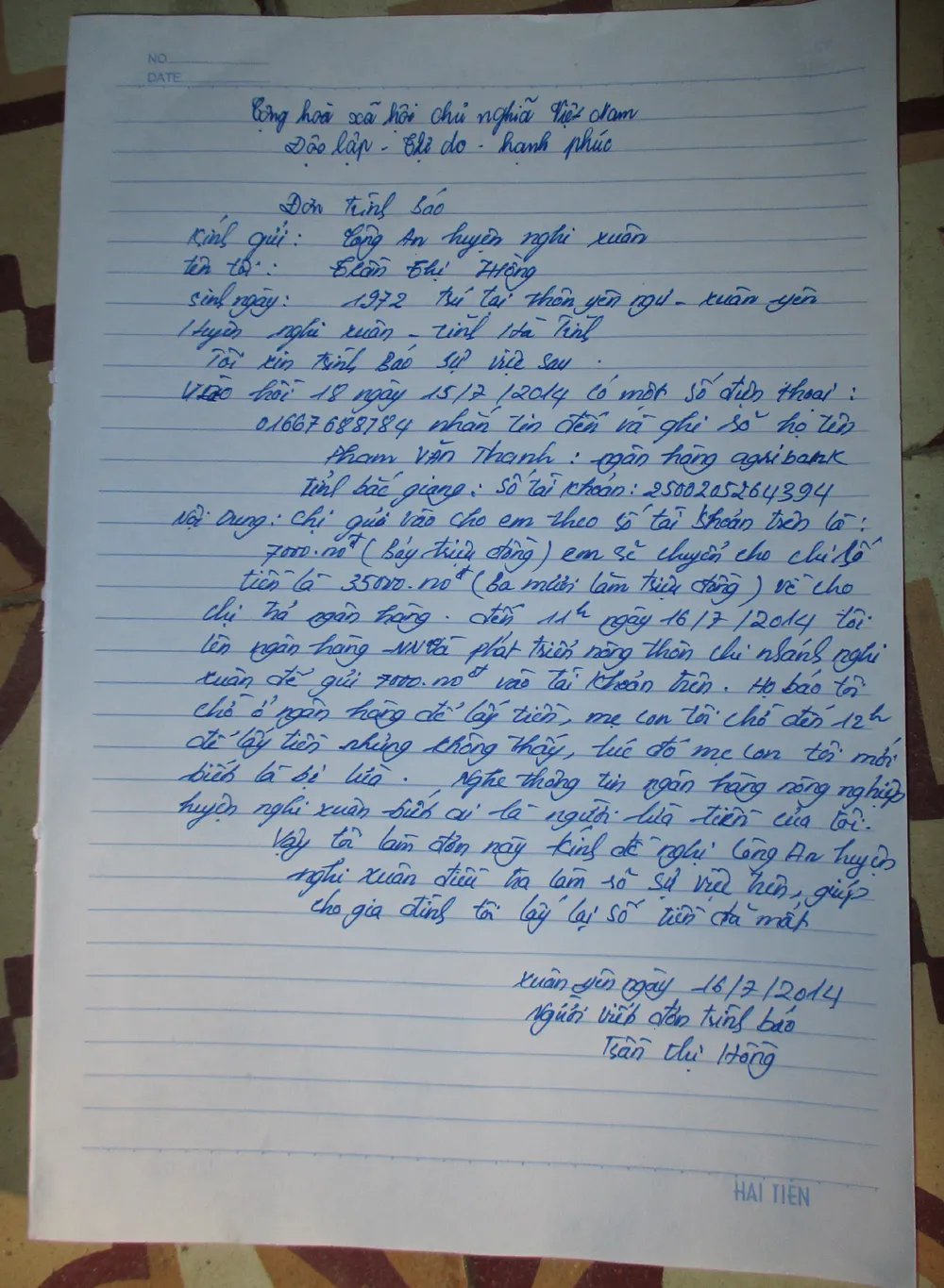 Đơn trình báo sự việc của chị Trần Thị Hồng.