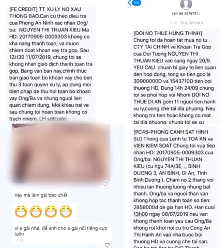 Những tin nhắn mà các đối tượng xấu mạo danh nhân viên Công ty FE CREDIT đe doạ, làm phiền khách hàng thuộc diện nợ xấu