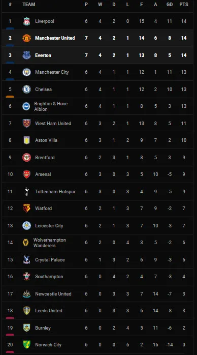 Hòa thất vọng 1-1 trước Everton, Manchester United đã có 2 trận liền không thắng trên sân nhà Old Trafford với chỉ 1 điểm giành được. Manchester United tạm vươn lên vị trí thứ hai trên bảng xếp hạng Premier League với 14 điểm.