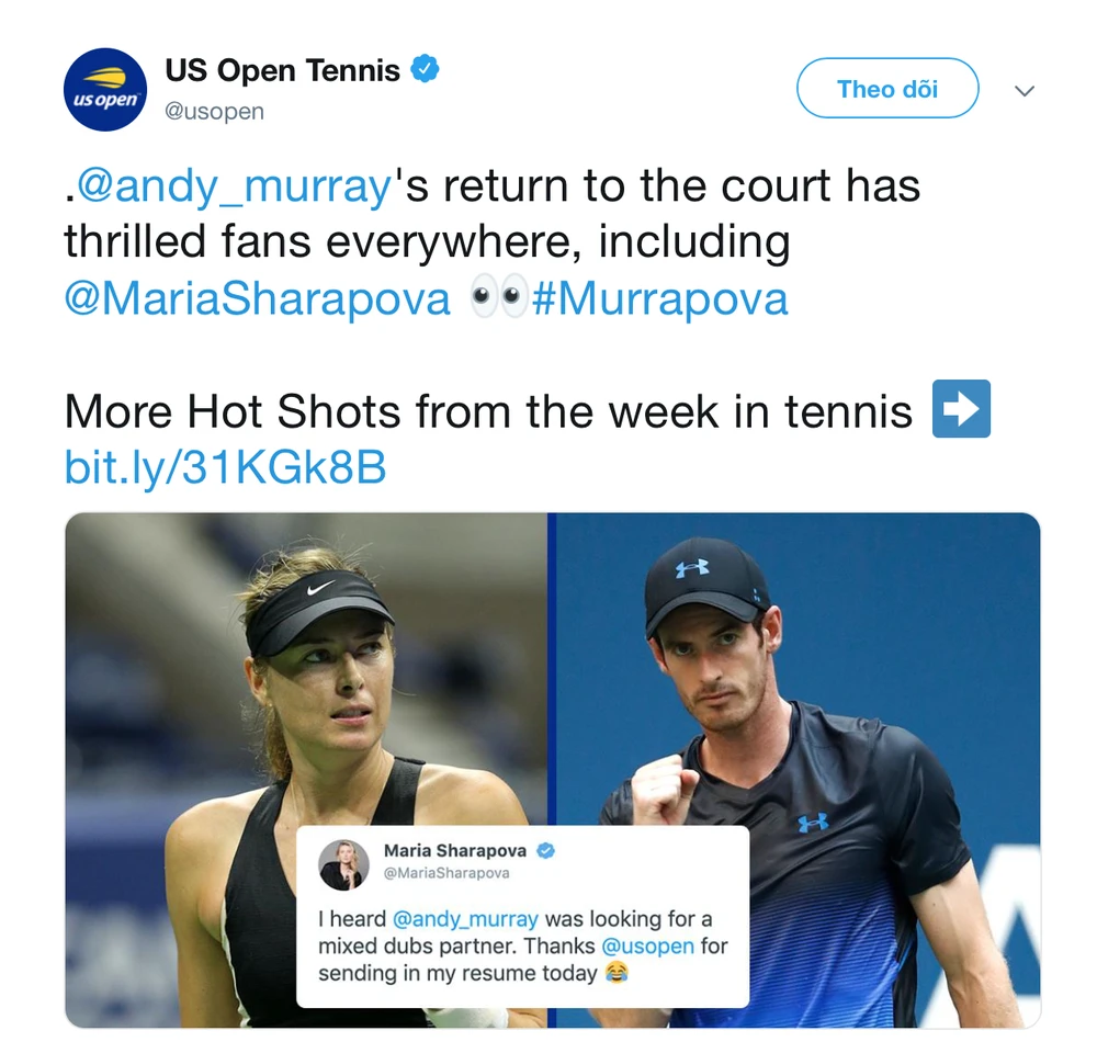 Bỏ qua những chỉ trích kịch liệt từ đồng nghiệp nam sau vụ doping năm 2016, Sharapova cảm ơn trang chủ Twitter US Open đã đưa ra gợi ý, cô nên đứng cặp với cựu vô địch Andy Murray. Tay vợt Anh vừa trở lại và đoạt vô địch đôi nam ATP Fever-Tree Championships sau ca chữa chấn thương hông.