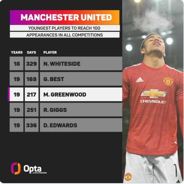 Với việc ra sân thi đấu cho MU ở đội hình xuất phát trong trận này, Mason Greenwood ở độ tuổi 19 và 217 ngày đã cán mốc 100 trận trong màu áo “quỷ đỏ”. Greenwood trở thành cầu thủ người Anh trẻ tuổi nhất cán mốc 100 trận cho MU.