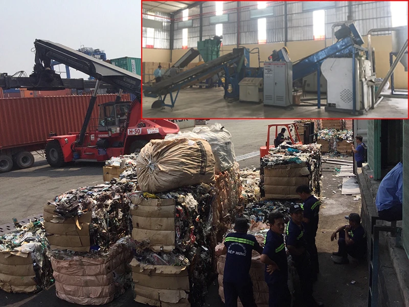 Hàng ngàn container phế liệu đang tồn đọng tại các cảng (ảnh lớn). Nhà máy của Công ty Nhựa Lê Trần ngừng hoạt động vì không có nguyên liệu sản xuất (ảnh nhỏ). Ảnh: QH