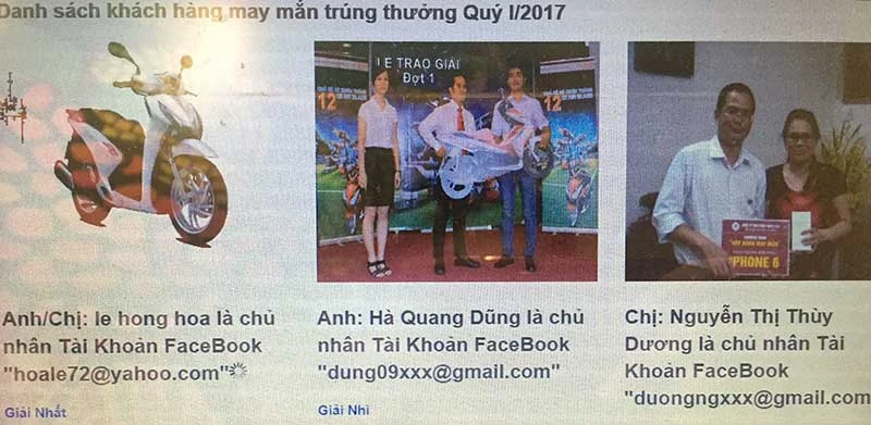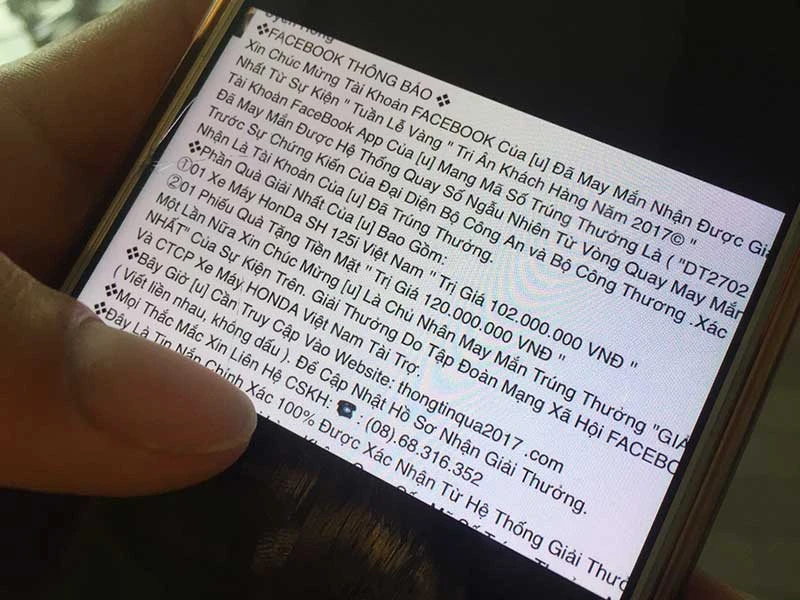 Chị Lê Hồng Anh, nhà ở quận Bình Tân, TP.HCM kể mới đây đã nhận được tin nhắn qua Facebook với nội dung “Chúc mừng tài khoản Messenger của bạn đã may mắn nhận được giải thưởng từ sự kiện Tuần lễ vàng tri ân khách hàng năm 2017. Tài khoản Facebook của bạn mang mã số DT2702 đã may mắn được hệ thống lựa chọn ngẫu nhiên, xác nhận là tài khoản đã trúng thưởng”.