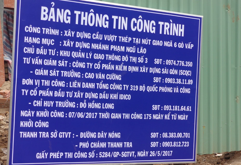 Bảng thông tin công trình cho biết nhánh cầu Phạm Ngũ Lão sẽ được thi công trong 175 ngày (gần sáu tháng, tính từ ngày khởi công 7-6).