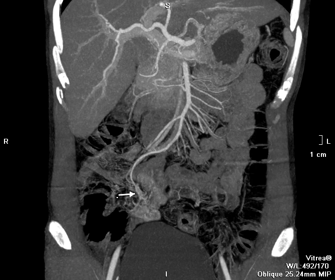 Kết quả chụp CT cho thấy bệnh nhân có búi dị dạng mạch máu trong lòng ruột, đang có dấu hiệu chảy máu. Đây là thủ phạm gây chảy máu kéo dài. Bệnh nhân được hội chẩn, điều trị khẩn cấp bằng phương pháp can thiệp mạch để nút búi dị dạng. Sau thủ thuật 24 giờ, bệnh nhân không còn triệu chứng chảy máu, hồi phục và xuất viện.