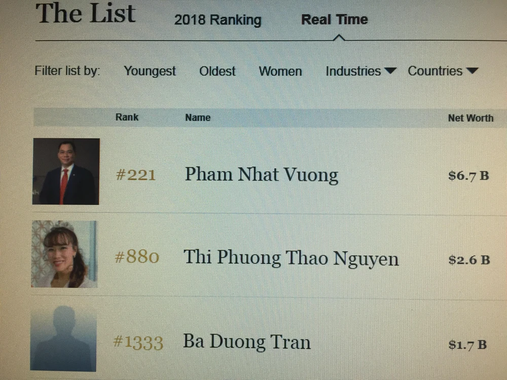 Hồi đầu năm, Forbes đã công bố danh sách tỉ phú thế giới năm 2018, với Việt Nam có bốn đại diện sở hữu tài sản tỉ USD, gồm Chủ tịch Vingroup Phạm Nhật Vượng, CEO VietJet Air Nguyễn Thị Phương Thảo, Chủ tịch Hòa Phát Trần Đình Long và Chủ tịch Thaco Trần Bá Dương.