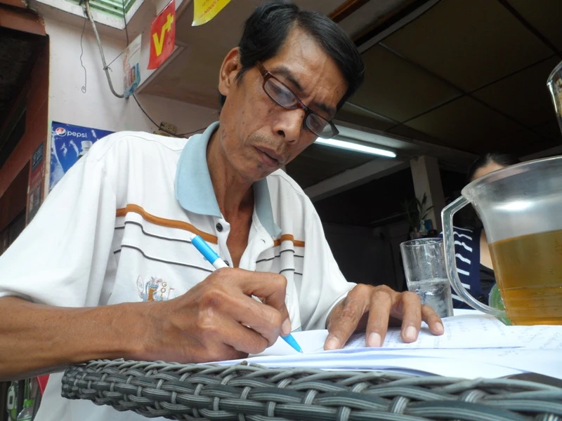 ÔngTrần Công Tuệ đang viết lại đơn giùm chị Phượng. Ảnh: NGUYỄN TRÀ
