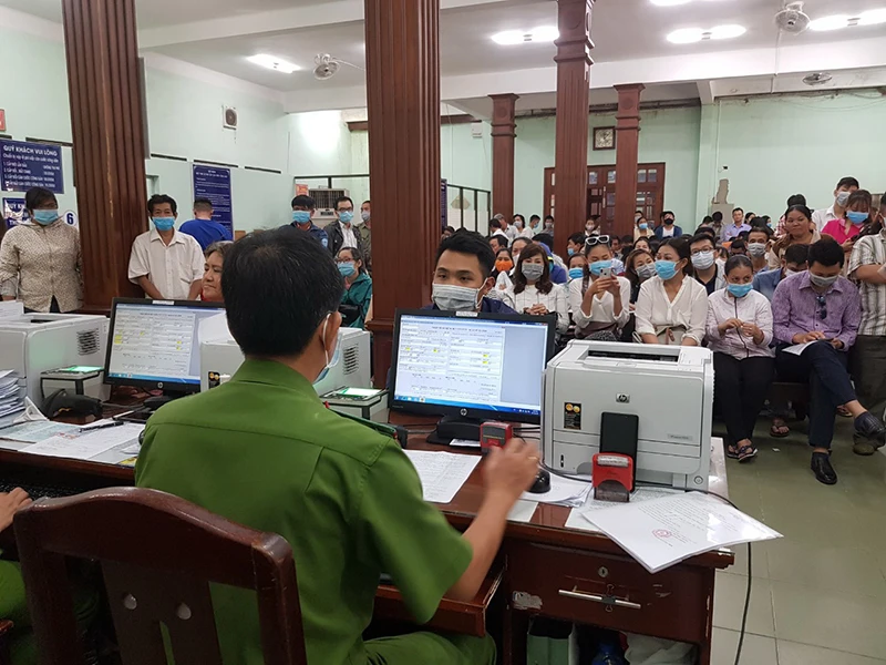 Người dân mang khẩu trang khi làm thủ tục cấp CCCD tại Phòng PC06, Công an TP.HCM. Ảnh: PC06