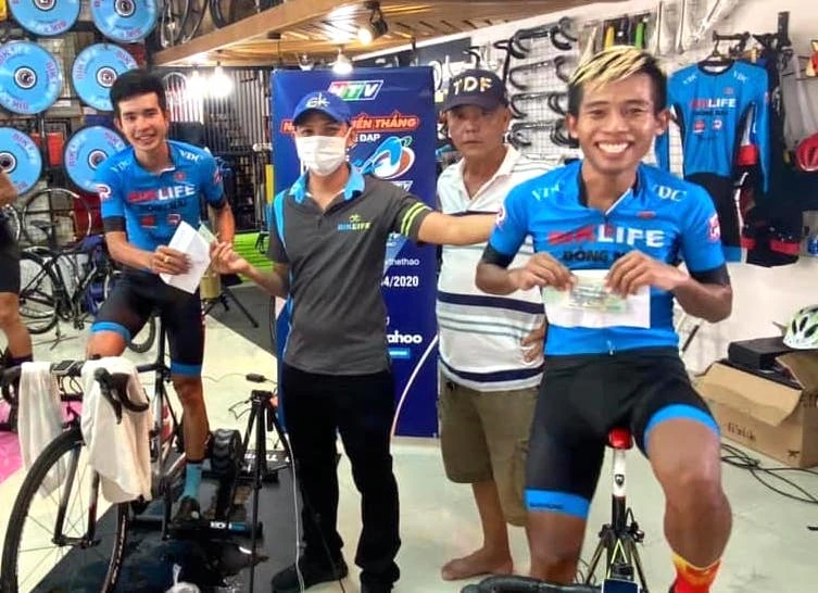 Tay đua Minh Tuấn (trái) vượt lên dẫn đầu giải thưởng áo vàng sau ba chặng. ẢNH: BLĐN