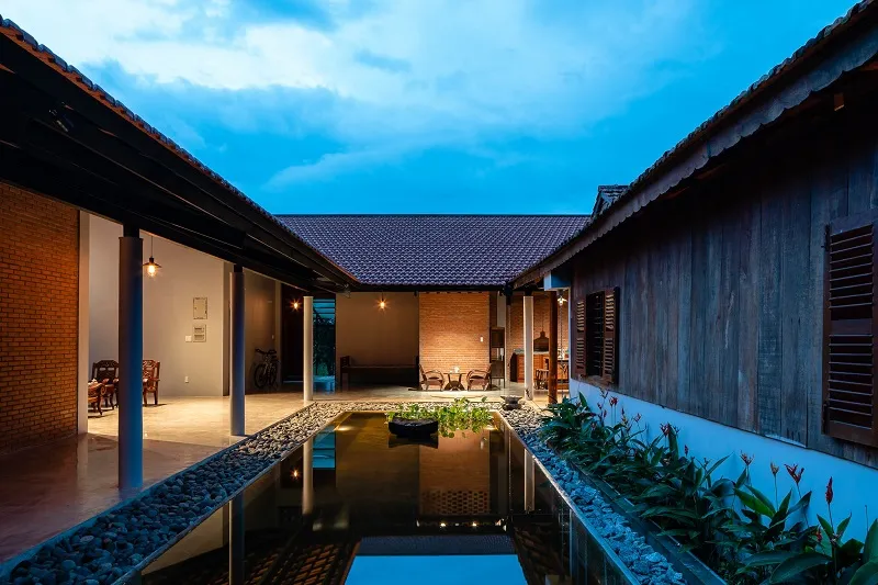 Nhóm KTS thiết kế An House với không gian mở, lối hành lang được ngăn cách bởi hồ nước.