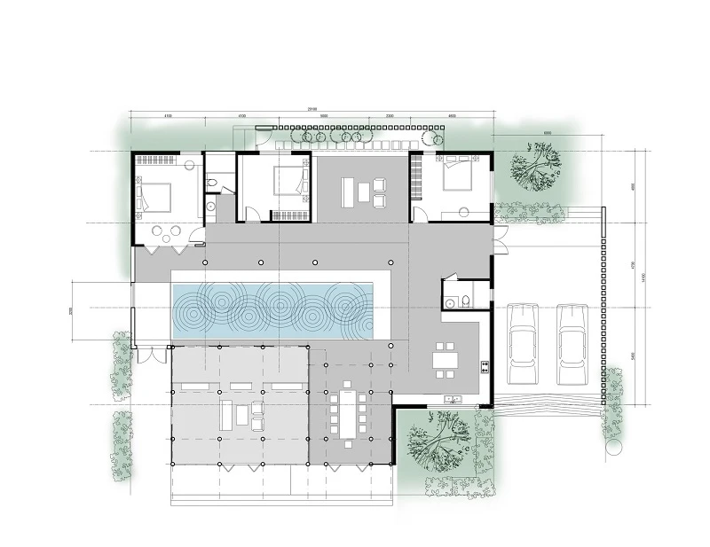 An House như một ốc đảo trong khu vườn 2.000 m2 chủ động đóng mở lấy gió từ phía ngoài và hoàn toàn mở ở phía trong nơi sân trong là một hồ nước phẳng.