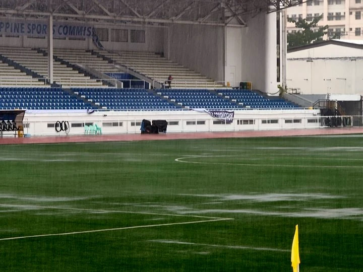 Sân Rizal Memorial ngập trong nước ở thời điểm 5 tiếng trước trận Việt Nam - Singapore.