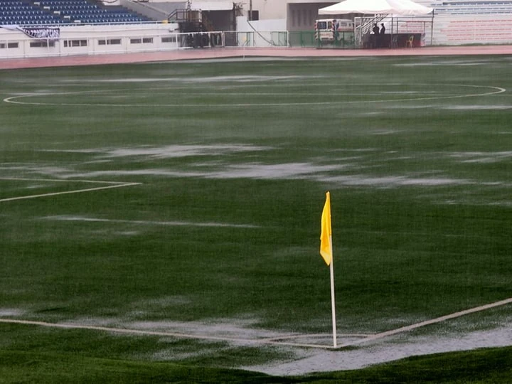 Ở chấm phạt góc, nước mưa đọng lại thành vũng lớn.