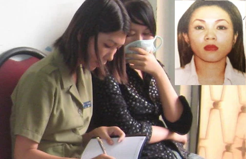 Một nạn nhân bị lừa qua Facebook đang trình báo với cơ quan công an. Võ Thị Xuân Lan (ảnh nhỏ) đang bị truy nã về tội lừa đảo chiếm đoạt tài sản. (Ảnh do cơ quan công an cung cấp)
