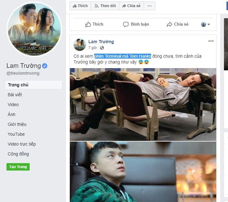 Theo kế hoạch, nam ca sĩ Lam Trường sẽ có mặt tại Mỹ vào tối 11-5 vì có show diễn ở Pala Casino (California). Anh cũng đã lên đường vào tối 9-5 (giờ Việt Nam). Tuy nhiên sáng nay, nam ca sĩ Lam Trường bất ngờ treo dòng trạng thái nói về bộ phim Terminal mà Tom Hanks giống như hoàn cảnh của Lam Trường.