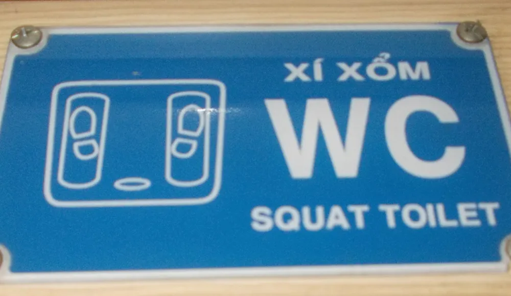 Trên cửa buồng vệ sinh ở các toa tàu do Công ty xe lửa Dĩ An đóng có gắn bảng với logo xí xổm và tiếng Anh hẳn hòi.
