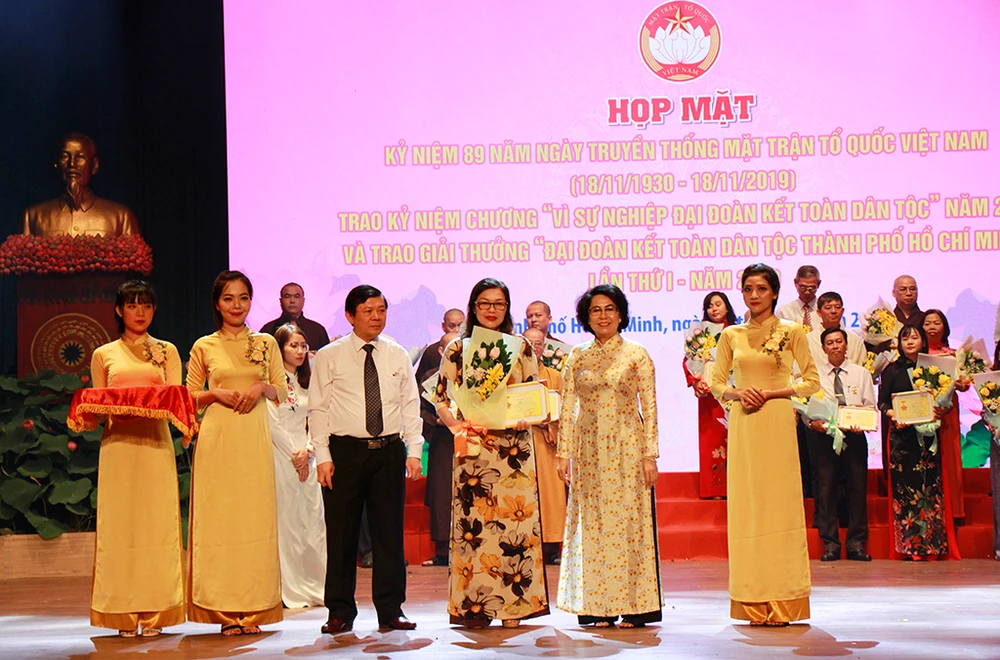 | Lần đầu tôn vinh giải thưởng Đại đoàn kết dân tộc TP.HCM Phát biểu ôn lại truyền thống MTTQ qua 89 năm, bà Tô Thị Bích Châu, Chủ tịch Ủy ban MTTQ Việt Nam TP.HCM, cho rằng đóng góp vào thành tựu chung của TP, MTTQ Việt Nam TP.HCM và các tổ chức thành viên đã có nhiều đổi mới về nội dung, phương thức hoạt động, các phong trào, cuộc vận động hướng mạnh về cơ sở. Công tác tuyên truyền, vận động, tập hợp nhân dân được thực hiện bằng nhiều hình thức… Theo bà Châu, TP.HCM cũng là nơi khởi đầu cho những phong trào mà từ đó nhân rộng ra toàn quốc, tiêu biểu là cuộc vận động “Toàn dân đoàn kết xây dựng đời sống mới” và sau này là “Toàn dân đoàn kết xây dựng nông thôn mới, đô thị văn minh” đã được duy trì và phát triển hơn 20 năm qua. MTTQ Việt Nam TP.HCM còn là ngọn cờ hiệu triệu và là nơi phối hợp hành động tổ chức thực hiện phong trào “Đền ơn đáp nghĩa”, nổi bật nhất là xây dựng nhà tình nghĩa cho các gia đình chính sách gặp khó khăn; cuộc vận động “Vì người nghèo” với phương châm “lấy sức dân chăm lo cho dân” đã góp phần thực hiện hiệu quả chương trình giảm nghèo bền vững của TP và phong trào Cả nước chung tay vì người nghèo để không ai bị bỏ lại phía sau. Công tác tuyên truyền vận động Quỹ Vì biển đảo quê hương, vì tuyến đầu Tổ quốc để chăm lo cho cán bộ, chiến sĩ đang ngày đêm canh giữ chủ quyền Tổ quốc nơi biên cương, hải đảo và thực hiện tốt công tác hậu phương quân đội... đã góp phần cùng cả nước trong việc bảo vệ chủ quyền quốc gia, lãnh thổ. Bà Châu cho biết với những thành quả trên mà Ủy ban MTTQ Việt Nam TP lần đầu tiên ghi nhận, tôn vinh giải thưởng "Đại đoàn kết toàn dân tộc TP.HCM lần thứ 1 - năm 2019. Đây là giải thưởng tôn vinh những cá nhân, tập thể chung sức, đoàn kết chăm lo cho cuộc sống của nhân dân, tìm thấy hạnh phúc chân chính của mình. Giải thưởng có sự tham gia của các tác giả như Nguyễn Đình Đầu với công trình quyển sách Chủ quyền Việt Nam trên biển Đông và Hoàng Sa - Trường Sa; là mô hình “Các chương trình, chiến dịch tình nguyện hè” của Đoàn TNCS Hồ Chí Minh TP; “Ngày hội nữ tu làm công tác xã hội từ thiện” của Hội Liên hiệp Phụ nữ TP… “MTTQ TP mong muốn qua giải thưởng này sẽ lan tỏa tinh thần, sức mạnh đại đoàn kết, khuyến khích, giới thiệu tập thể, cá nhân tiếp tục sáng tạo, hiến kế và cống hiến sức mình để xây dựng và phát triển TP phồn vinh, “có chất lượng sống tốt, văn minh, hiện đại, nghĩa tình”” - bà Châu nhấn mạnh. --- Tại lễ kỷ niệm, Ủy ban MTTQ Việt Nam TP đã tổ chức trao kỷ niệm chương “Vì sự nghiệp đại đoàn kết dân tộc” năm 2019 cho 221 cá nhân có nhiều đóng góp trong công tác Mặt trận. Đồng thời trao giải thưởng “Đại đoàn kết toàn dân tộc TP.HCM” lần I - năm 2019 cho năm tập thể, hai cá nhân có công trình, sáng kiến, cách làm hay, góp phần tăng cường, củng cố xây dựng và phát huy sức mạnh khối đại đoàn kết toàn dân tộc trên địa bàn TP. |