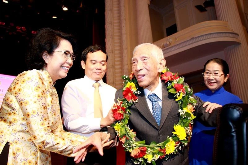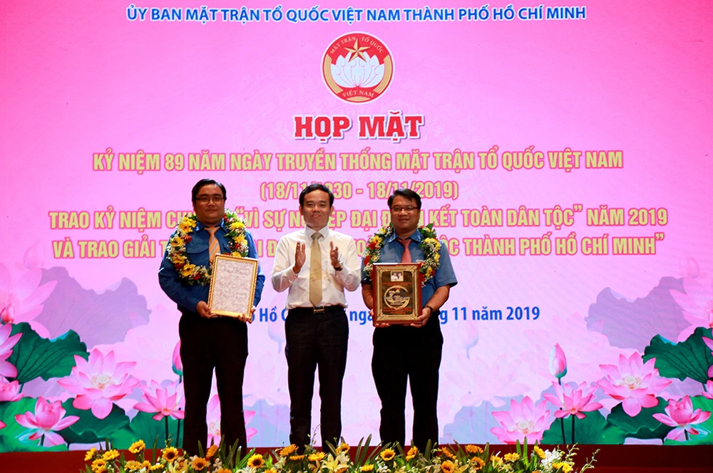Ông Trần Lưu Quang, Phó Bí thư thường trực Thành ủy TP, trao giải thưởng “Đại đoàn kết toàn dân tộc TP.HCM” lần I - năm 2019. Ảnh: VŨ HOÀNG