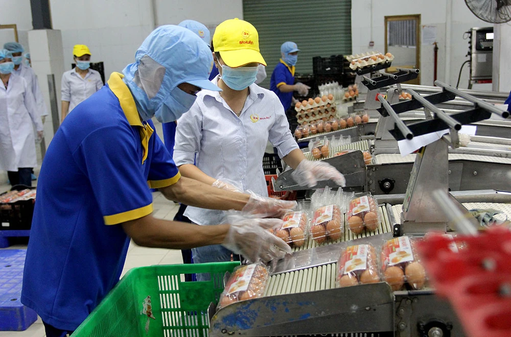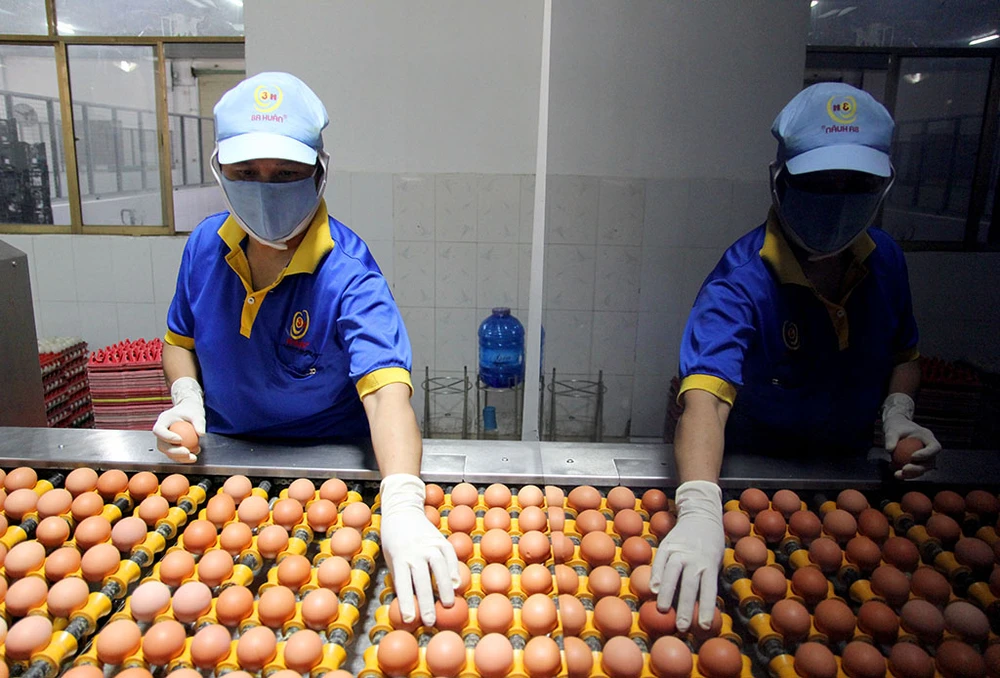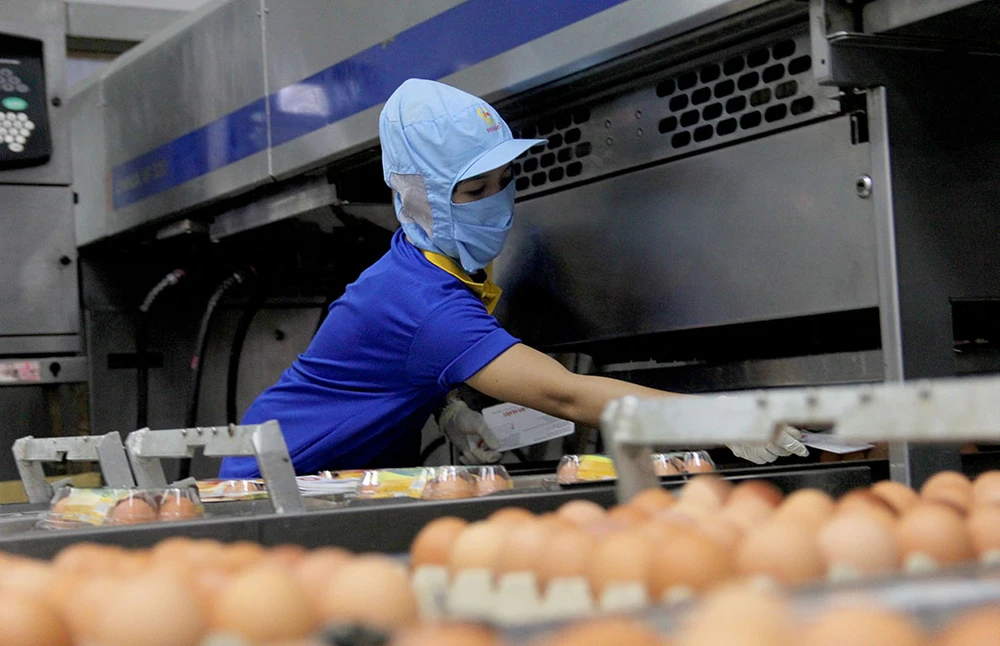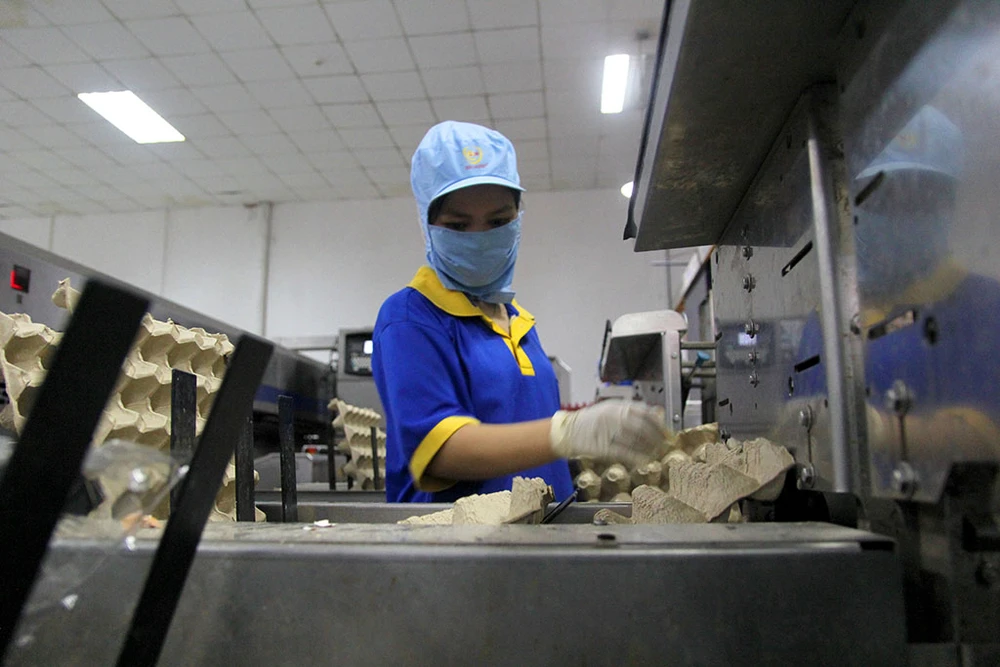 Công nhân đang đặt nhãn hiệu sản phẩm vào hộp trứng. Ảnh: HOÀNG GIANG